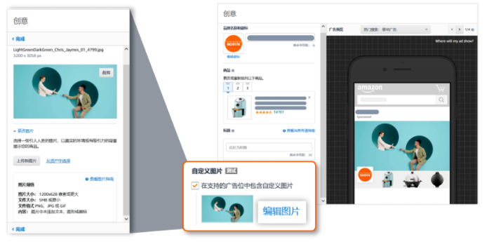 广告主可在广告活动管理器中创建品牌广告活动,通过商品集格式的创意板块编辑自定义图片。